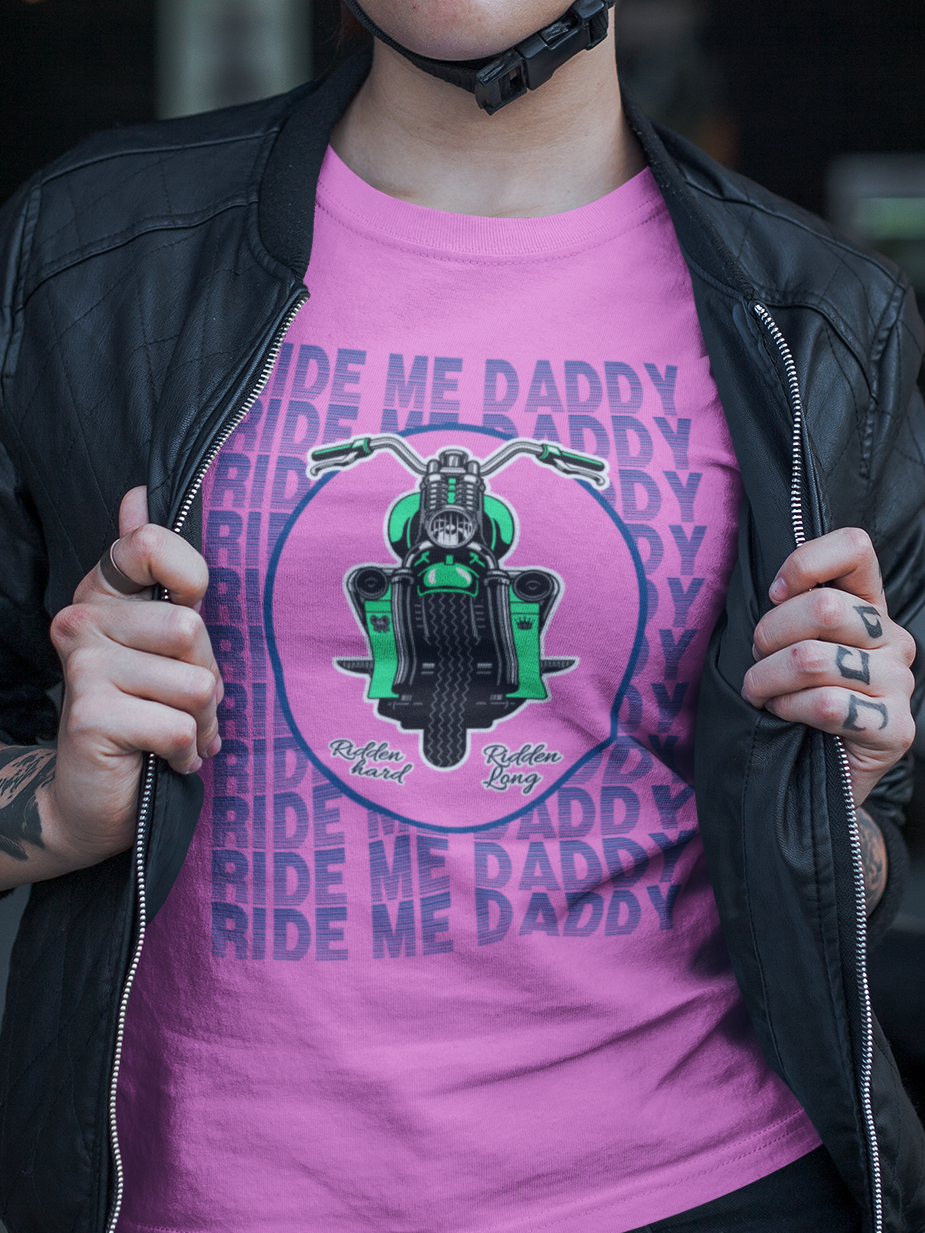 Time to spice up your road game with our Ride Me Daddy Motorcycle T-shirt. If you are a Daddy's Princess with a love for a firm seat and wind in your hair, then this t-shirt will bring your worlds together for you in one place.
