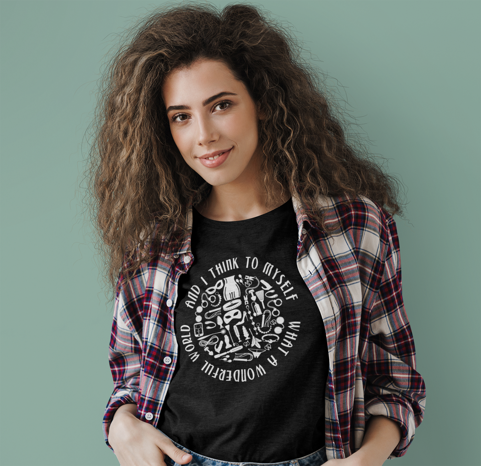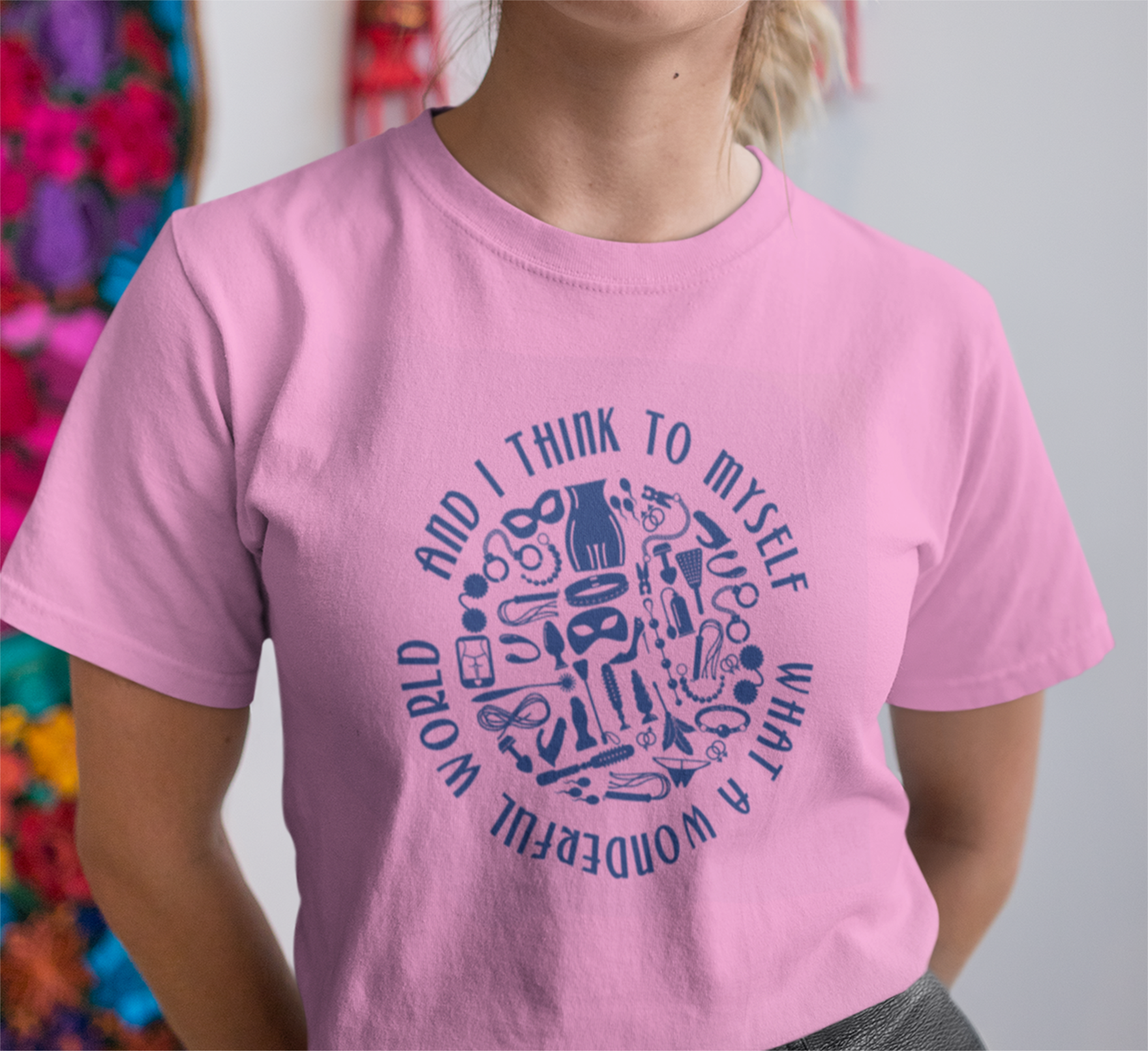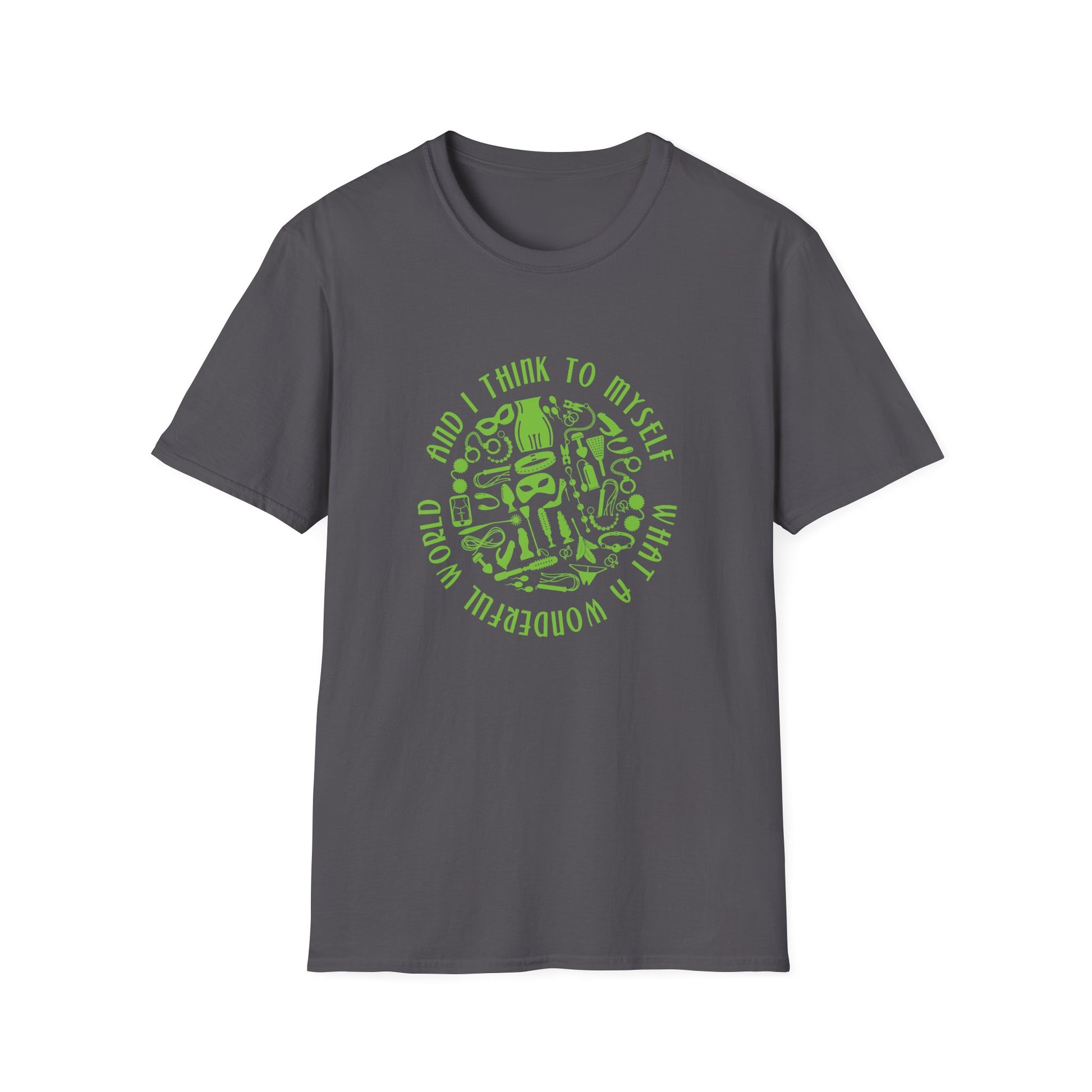 Introducing your next favorite party shirt. Our "What a Wonderful World" t-shirt is going to have everyone turning heads to get a second look and Louie Armstrong grinning in his grave. If you've got the spunk to wear it, you'll be celebrating the thrill of BDSM adult fun and play. We recommend keeping this one away from the church picnic!